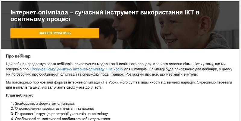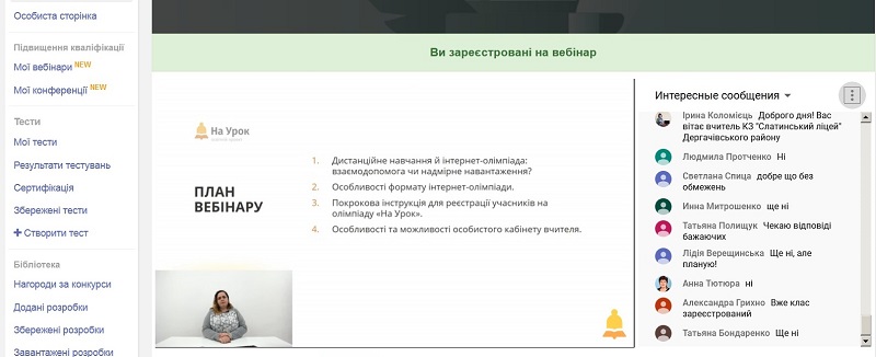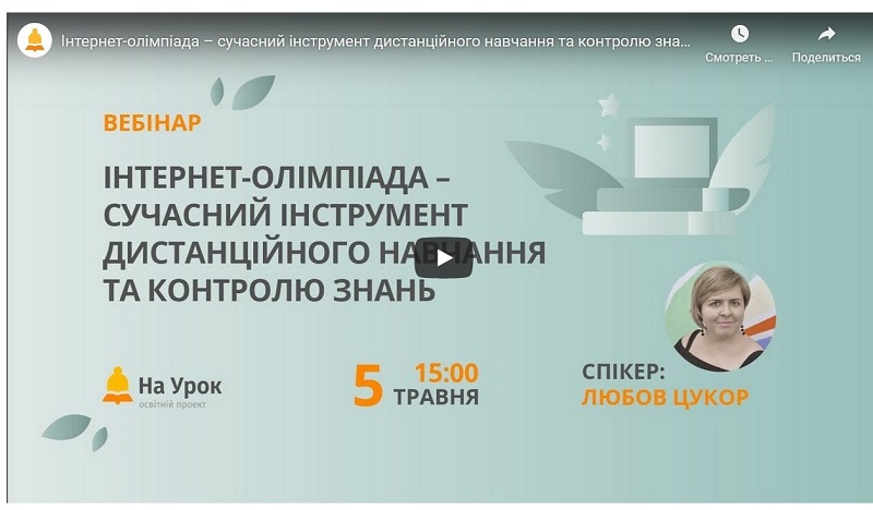 Під час вебінару спікер онлайн-платформи освітнього проекту «На Урок» Любов Цукор розповіла про місце інтернет-олімпіад у дистаційному навчанні, поділилася власним досвідом роботи, а також детально продемонструвала особливості інтернет-олімпіади «На Урок», її формат і переваги для учасників та викладачів.