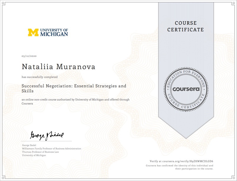 Закінчила курс навчання на платформі онлайн-освіти Coursera «Успішне ведення переговорів: необхідні стратегії та навики» Мічиганського університету і директор інституту, професор Наталія Муранова. Адже цей курс завжди є актуальним, так як неабиякий успіх для будь-якого керівника залежить від мистецтва ведення переговорів щодня. Це і переговори на особистому рівні з друзями, родиною, орендодавцями, співробітниками, стейхолдерами тощо. Успішне ведення переговорів також є запорукою успіху в бізнесі, освіті, науці, особливо, коли мова йде про вигідні контракти. У компанії компетентно проведені переговорів можуть призвести навіть до просування по службі. «Успішне ведення переговорів» є одним з найпопулярніших і високо оцінених MOOC у всьому світі.