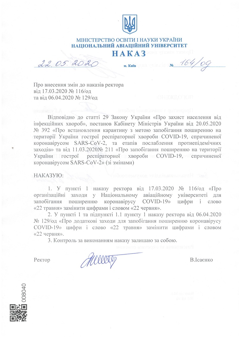 Наказом ректора Володимира Ісаєнка № 164/од від 22 травня 2020 року відповідно до до статті 29 Закону України «Про захист населення від інфекційних хвороб», постанов Кабінету Міністрів України від 20.05.2020 № 392 «Про встановлення карантину з метою запобігання поширенню на території України гострої респіраторної хвороби COVID-19, спричиненої коронавірусом SARS-CoV-2, та етапів послаблення протиепідемічних заходів» та від 11.03.2020№ 211 «Про запобігання поширенню на території України гострої респіраторної хвороби COVID-19, спричиненої коронавірусом SARS-CoV-2» (зі змінами), внесено часткові зміни до наказів № 116/од від 17.03.2020р та № 129/од від 06.04.2020 року.