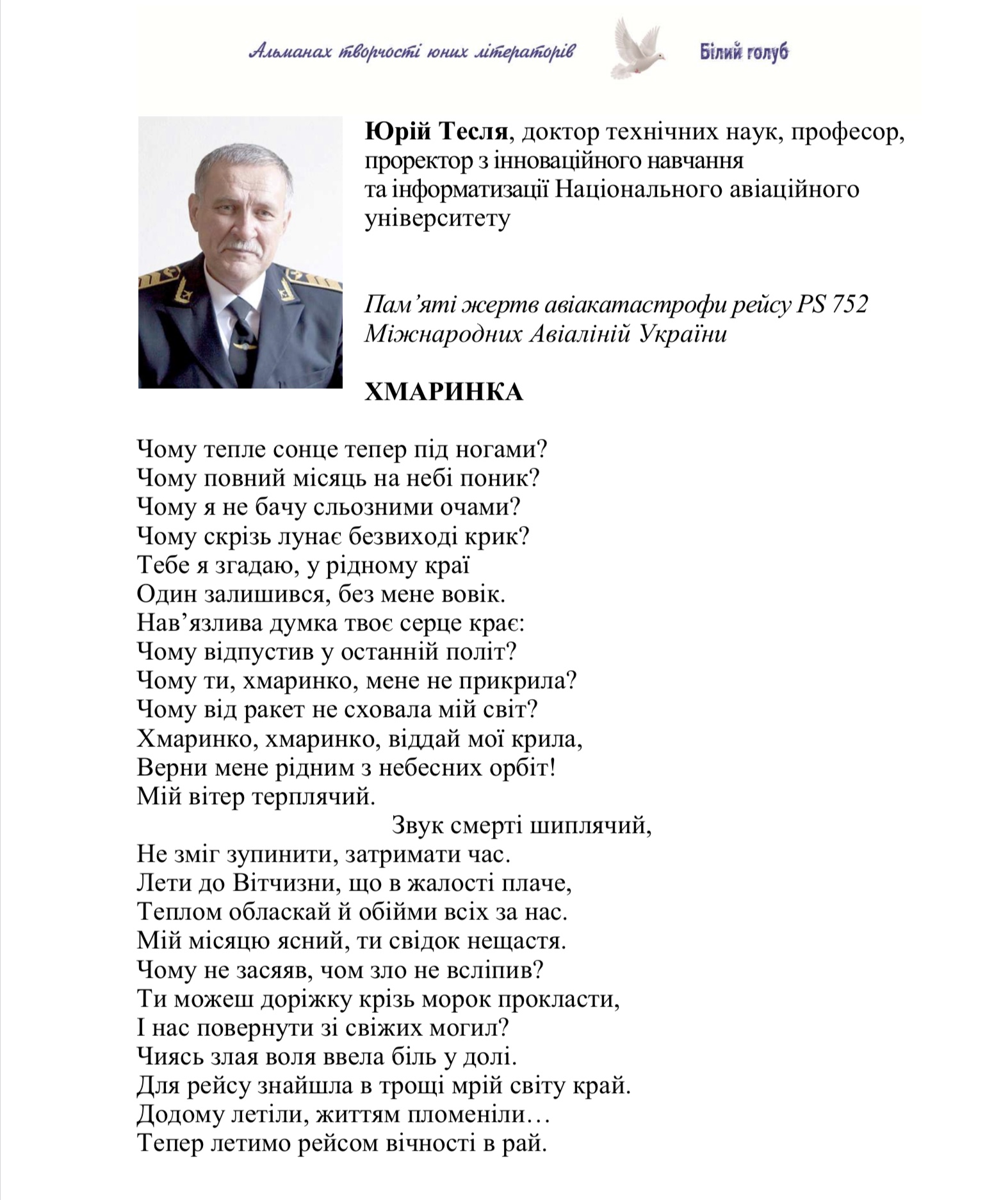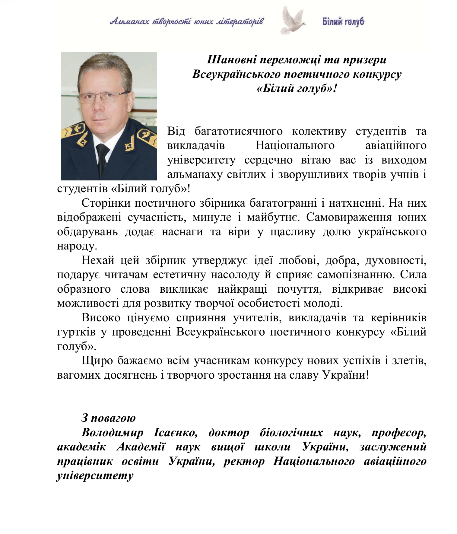У 2019-2020 навчальному році Навчально-науковий інститут інноваційних освітніх технологій Національного авіаційного університету започаткував Всеукраїнський поетичний конкурс «Білий голуб», який відбувся до Всесвітнього дня книги і авторського права. Конкурс спрямований на підтримку обдарованих учнів і студентів у галузі «Літературна творчість» й творчої праці талановитих педагогів.