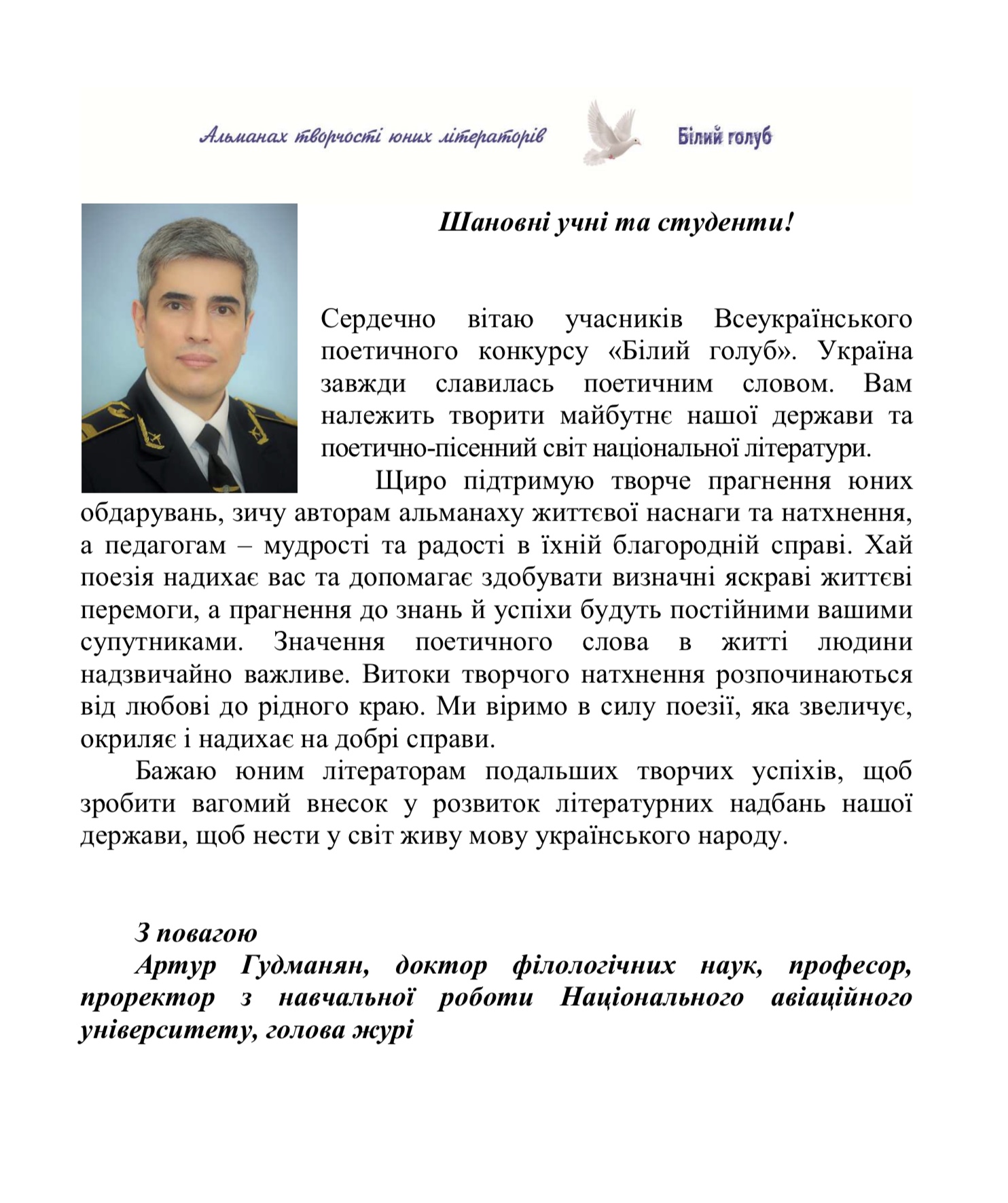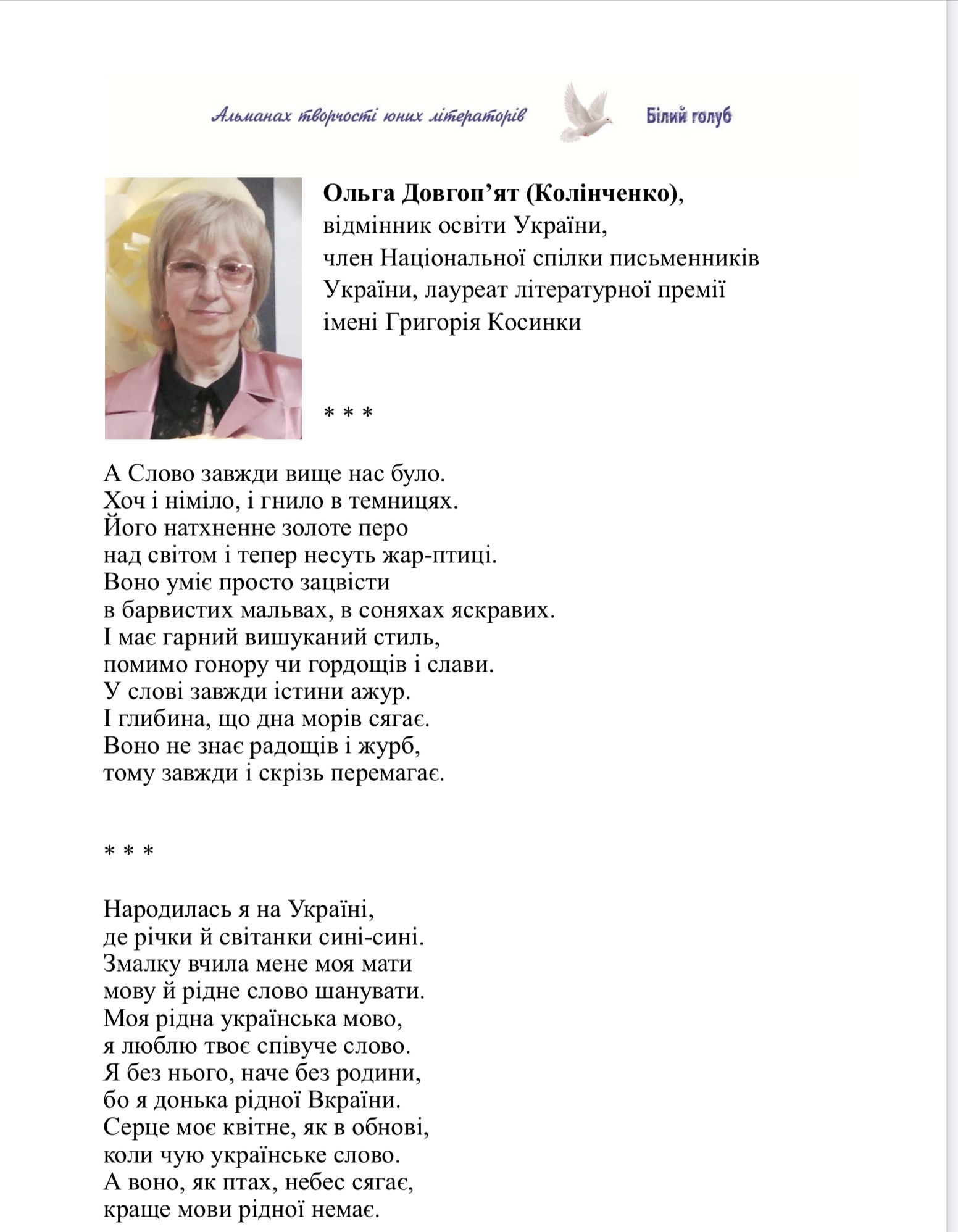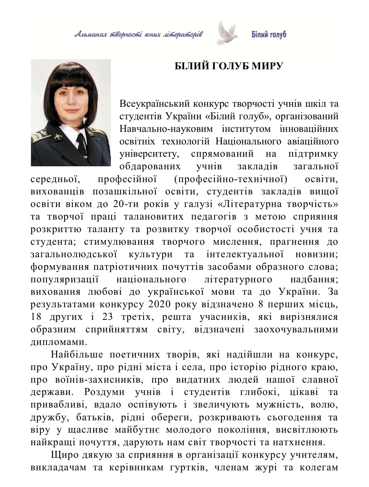 Творчий порив юних талантів і обдарувань надихає, звеличує та окриляє. Сподіваємося, що поетичний збірник «Білий голуб» не залишить байдужих, подарує естетичну насолодуі додасть всім читачам життєвої наснаги та творчого натхнення на славу Вітчизни.