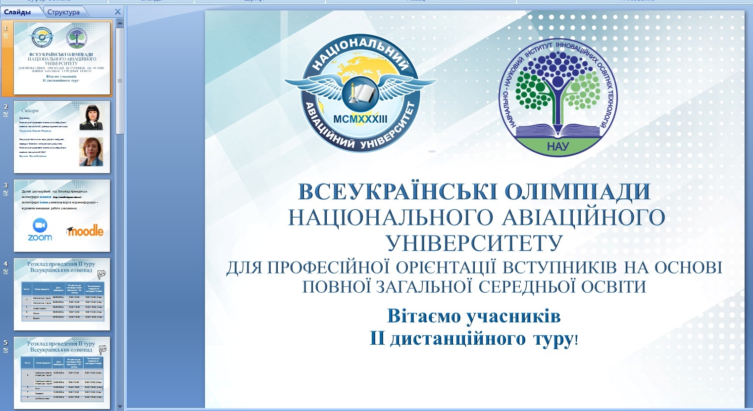 Задля налагодження належної комунікації між учасниками олімпіад, членами оргкомітету та журі відбулося ряд робочих он-лайн зустрічей, на яких було оприлюднені «Умови та порядок проведення ІІ (дистанційного) туру Всеукраїнських олімпіад Національного авіаційного університету для професійної орієнтації вступників на основі повної загальної середньої освіти».