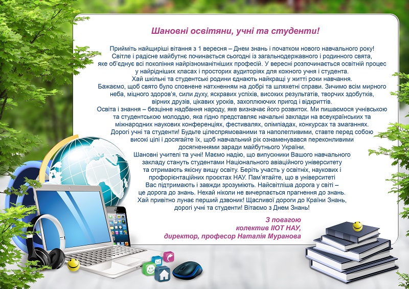 Шановні учителі та учні! Маємо надію, що випускники Вашого навчального закладу стануть студентами Національного авіаційного університету та отримають якісну вищу освіту. Беріть участь у освітніх, наукових і профорієнтаційних проєктах НАУ. Пам’ятайте, що в університеті Вас підтримають і завжди зрозуміють.
