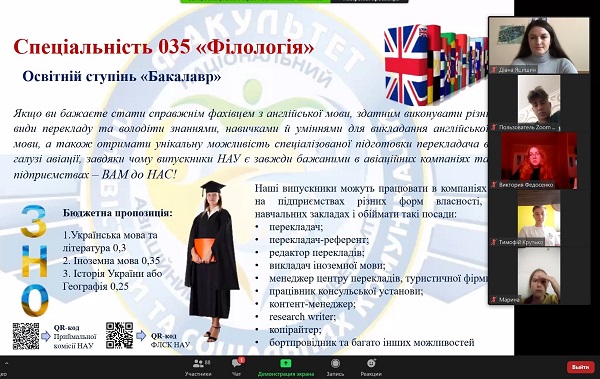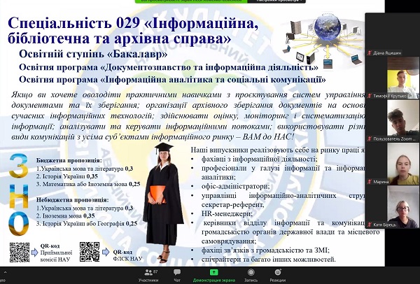 Про сучасні та популярні професії ринку праці перекладач; редактор перекладів; PR-менеджер; бортпровідник; викладач закладу вищої освіти; офісний адміністратор; організатор діловодства; керівник малих підприємств у сфері надання інформації; інспектор; начальник відділу кадрів, канцелярії; виконавчий директор; референт-аналітик; архівіст; директор архіву; зберігач фондів; науковий співробітник; політичний аналітик; викладач політології; референт-помічник депутата; спеціаліст прес-служби; політтехнолог; іміджмейкер; психолог; фахівець із соціального захисту населення майбутнім абітурієнтам розповіли спікери-доценти Леся Хоменко-Семенова, Людмила Доценко, Тетяна Петренко.