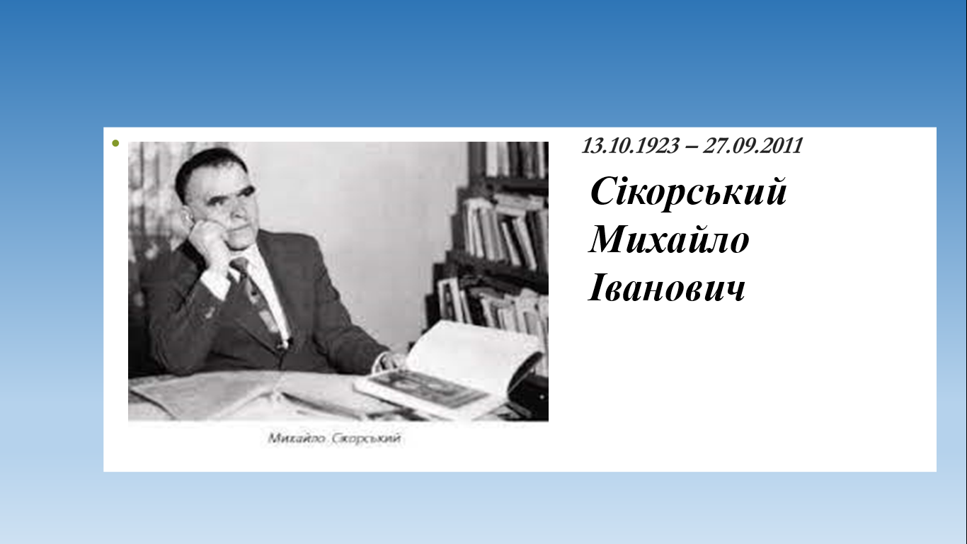 13 жовтня 2023 року – 100 років від дня народження Михайла Івановича Сікорського – видатного історика, етнографа, музеєзнавця, археолога, творця переяславських музеїв, патріарха музейної справи, почесного генерального директора Заповідника, Героя України.